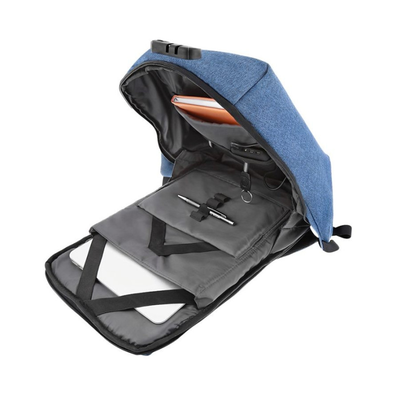 Meet the travel companion that thieves really hate! This backpack, with an external USB port for charging mobile devices (phone, tablet, portable speakers, Bluetooth headset), has a zipper closure hidden in the back to protect your objects from the curious eyes. Made of a waterproof material, it has several padded pockets for a good internal organization.